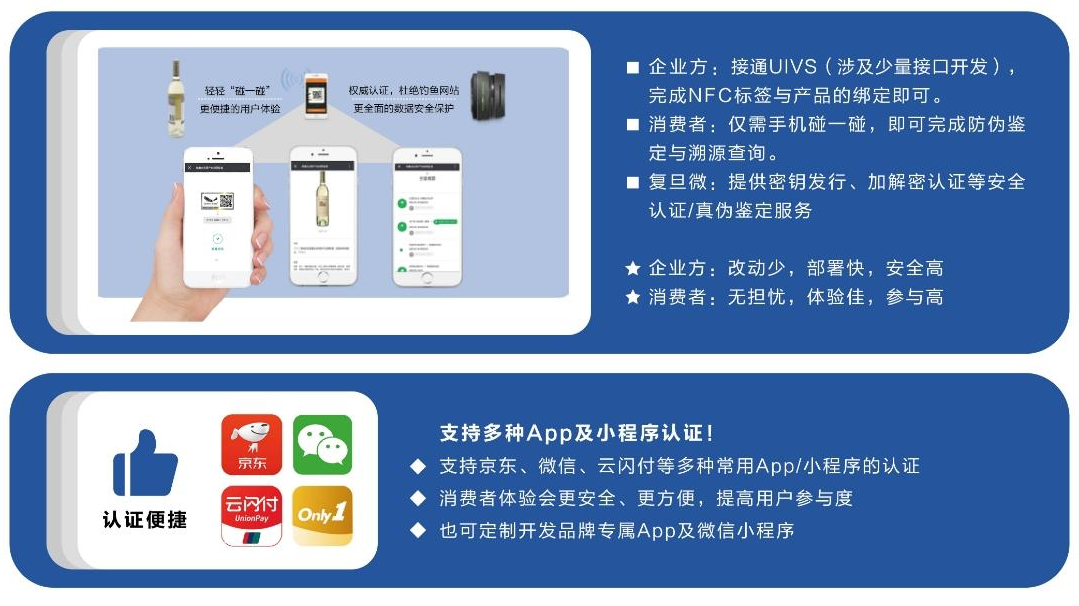 為了讓企業(yè)更便捷地用上PUF芯片指紋技術(shù),復(fù)旦微提供UIVS(Uniqueness Issuance and Validation Services),即“唯一性發(fā)行與認(rèn)證服務(wù)”,這是一項圍繞PUF芯片應(yīng)用的安全系統(tǒng)解決方案,旨在為客戶提供PUF芯片相關(guān)的密鑰生產(chǎn)發(fā)行、云認(rèn)證、跨域互通以及可信存證服務(wù)。且UIVS服務(wù)支持多種App/小程序的認(rèn)證,即消費者直接使用京東app、銀聯(lián)云閃付app、微信小程序、真品無雙、品牌定制app/微信小程序即可實現(xiàn)快速認(rèn)證和溯源查詢。 UIVS服務(wù)采用SAAS標(biāo)準(zhǔn)模塊,可與企業(yè)現(xiàn)有的應(yīng)用系統(tǒng)直接快速對接,最快一周實施上線。或者企業(yè)可選擇基于UIVS的全套防偽溯源系統(tǒng),即“真品無雙”防偽溯源系統(tǒng),該系統(tǒng)包括UIVS發(fā)行與認(rèn)證系統(tǒng)、數(shù)據(jù)系統(tǒng)、及“真品無雙”及企業(yè)定制app及小程序,客戶可直接使用。 目前PUF芯片防偽溯源服務(wù)已應(yīng)用于知名煙酒茶品﹑藥品食品﹑工藝收藏﹑鑒定證書﹑潮牌運動﹑奢品家居﹑電商平臺﹑安全物聯(lián)﹑互娛周邊等眾多領(lǐng)域。