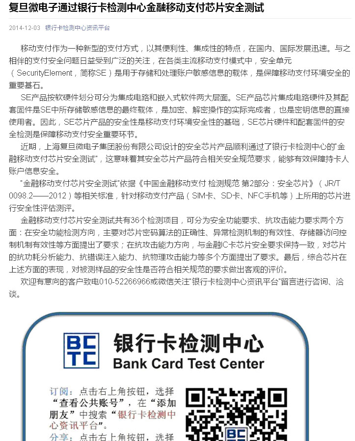 復旦微電子芯片通過銀行卡檢測中心金融移動支付芯片安全測試