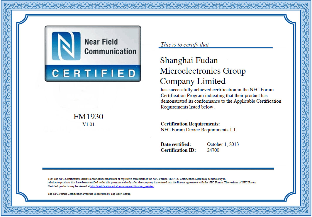 公司設計的NFC控制芯片FM1930,10月1日獲國際組織NFC論壇的認證。這是國內首款通過NFC論壇認證的NFC控制芯片。