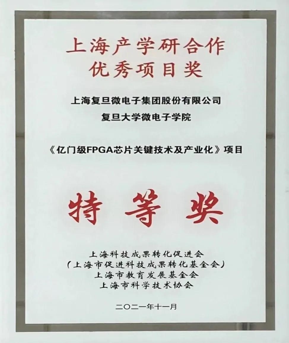 經(jīng)過前期的推薦申報(bào)、專家評審和社會公示,經(jīng)上海科技成果轉(zhuǎn)化促進(jìn)會、上海市教育發(fā)展基金會、上海市科學(xué)技術(shù)協(xié)會審定批準(zhǔn),授予上海復(fù)旦微電子集團(tuán)股份有限公司、復(fù)旦大學(xué)微電子學(xué)院的合作項(xiàng)目《億門級FPGA芯片關(guān)鍵技術(shù)及產(chǎn)業(yè)化》2021年上海產(chǎn)學(xué)研合作優(yōu)秀項(xiàng)目獎(jiǎng)特等獎(jiǎng)。