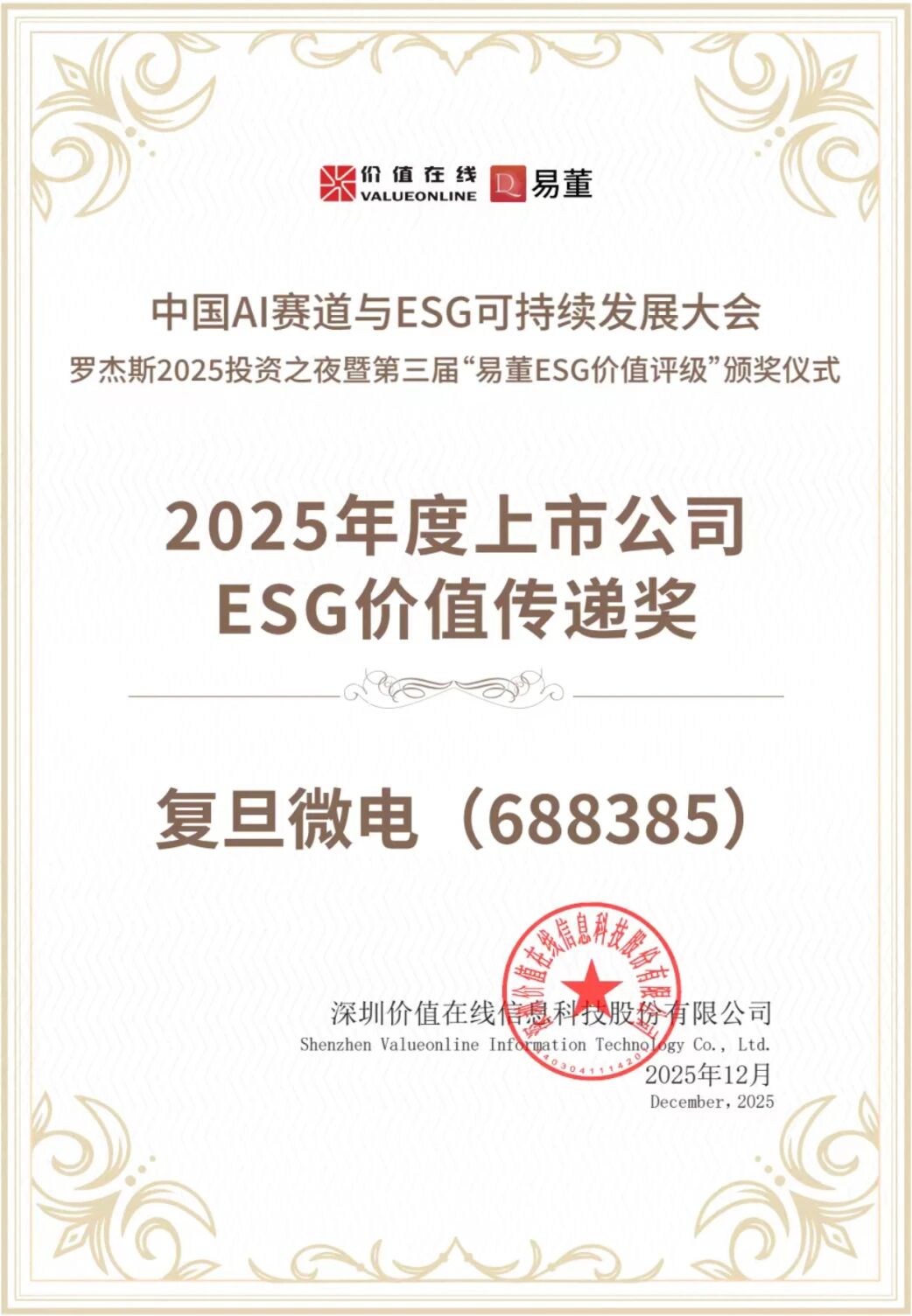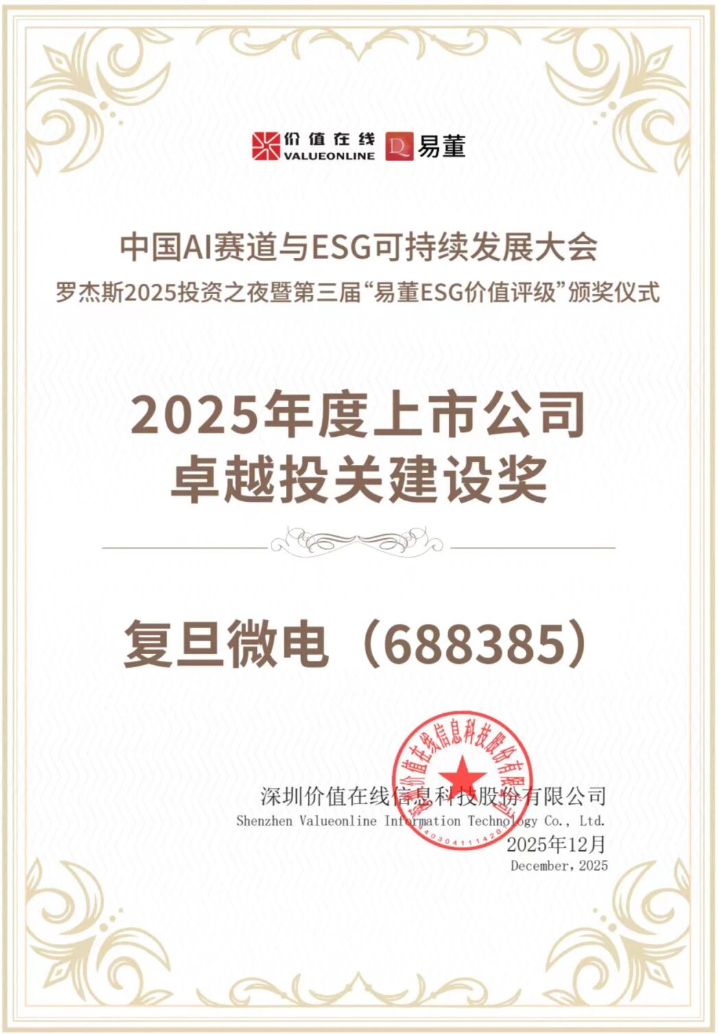 近日,“2025中國(guó)AI賽道與ESG可持續(xù)發(fā)展大會(huì)”在深圳召開(kāi),在大會(huì)期間舉行的“易董ESG價(jià)值評(píng)級(jí)”頒獎(jiǎng)典禮上,復(fù)旦微電(證券代碼:688385.SH)憑借其在環(huán)境、社會(huì)及治理維度和在投資者關(guān)系管理方面的突出表現(xiàn),成功摘得“2025年度上市公司ESG價(jià)值傳遞獎(jiǎng)”及“2025年度上市公司卓越投關(guān)建設(shè)獎(jiǎng)”。