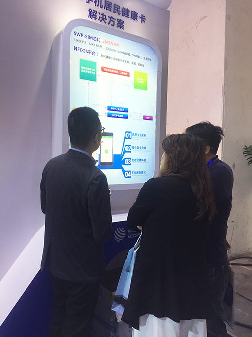 我司展臺前,本次展出的手機居民健康卡方案引起廣泛矚目。大量觀眾和專業(yè)人士前來咨詢并進行深度洽談。復旦微電子手機居民健康卡解決方案是是基于手機NFC技術(shù)的移動居民健康卡方案。該方案采用復旦微電子FM151M安全加密芯片,電信運營商發(fā)行手機NFC SIM卡,通過衛(wèi)計委TSM平臺和電信TSM平臺,加載居民健康卡應用實現(xiàn)一卡多用。目前已經(jīng)在上海、湖北兩地得到成功應用。