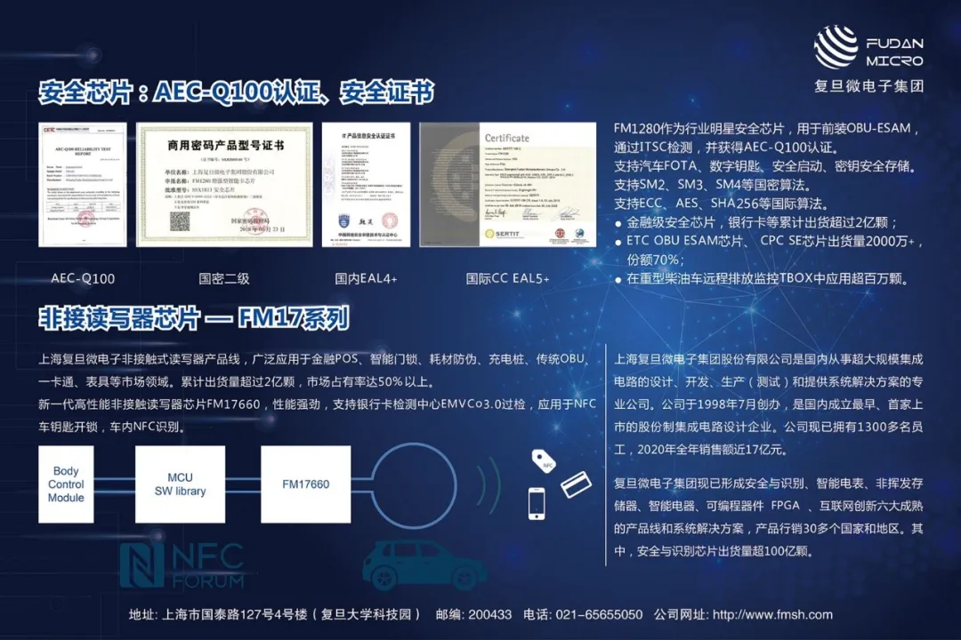 在ICDIA同期舉辦的“首屆汽車芯片供需對(duì)接會(huì)”上,復(fù)旦微電子集團(tuán)北京分公司總經(jīng)理段永剛,為在座30多家汽車與零部件企業(yè),介紹了公司“汽車數(shù)字鑰匙-NFC+安全芯片”的解決方案。憑借公司在汽車NFC芯片、安全芯片領(lǐng)域的技術(shù)積累和獨(dú)創(chuàng)優(yōu)勢(shì),復(fù)旦微電子榮獲 “2021年度創(chuàng)新企業(yè)”。該獎(jiǎng)項(xiàng)由整車和零部件專家評(píng)選,共評(píng)出十家本土汽車芯片創(chuàng)新企業(yè),代表了行業(yè)對(duì)于復(fù)旦微電子在汽車電子領(lǐng)域的高度認(rèn)可。