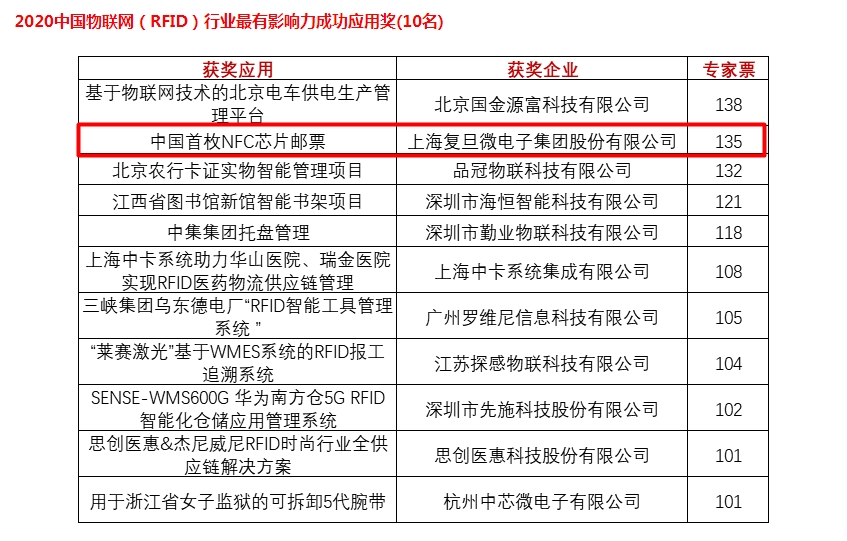 由上海復(fù)旦微電子集團(tuán)股份有限公司自主研發(fā)的NFC芯片復(fù)合搭載于中國(guó)首枚NFC芯片,這一應(yīng)用獲得專家評(píng)委高票認(rèn)可,榮膺“2020‘物聯(lián)之星’年度評(píng)選之物聯(lián)網(wǎng)-RFID行業(yè)最有影響力成功應(yīng)用獎(jiǎng)。”